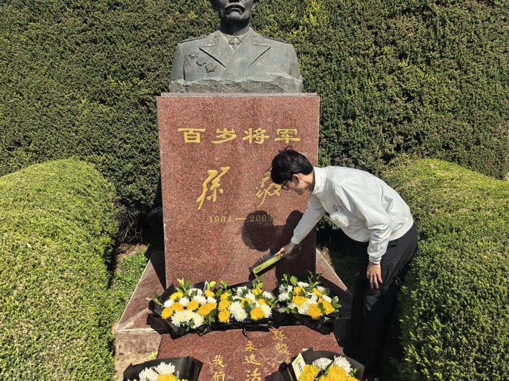 文化传媒与服务系的同学们前往万桐园,开展祭奠开国中将孙毅将军主题团日活动。全体人员身着整洁服装,手持白花,神情肃穆,在孙毅将军墓碑前默哀致敬、敬献鲜花、擦拭墓碑,深情追思先烈们为国家独立和民族解放,抛头颅、洒热血的英勇事迹。学生代表深情宣讲孙毅将军戎马一生的革命事迹,带领大家重温烽火岁月的峥嵘历程,感悟将军铁骨铮铮、一心为民的崇高风范,让红色精神直抵人心、浸润心田。“我志愿加入中国共产主义青年团……”重温入团誓词的声音,铿锵有力,在陵园上空久久回荡。这不仅是对先烈的告慰,更是新时代青年对祖国许下的庄严承诺。