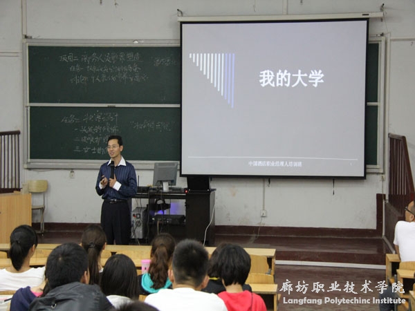 讲座开始后,王增琪总监主要为同学们讲述了两方面的内容,首先讲的是“我的大学生活”, 王增琪总监以他自身为例向同学们介绍了大学期间如何学习、如何锻炼综合能力,以及成功的经验之谈。其次,他讲述了关于走向未来的路径,期间进行了“因成就他人而成功”为题目的一分钟演讲互动,让同学们感受到锻炼表达能力与临场发挥能力,在通往成功道路上的重要性。他叮嘱同学们要明析方向,看到实现的未来且要有具体的目标与理想。再次,王增琪总监为同学们诠释了人格魅力的涵义,及在以后的工作和人际交往中起到的主导作用。最后,全系新生全体起立为王增琪总监送上了最衷心、热烈的掌声。