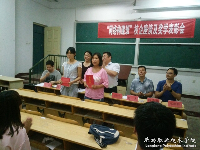 6月27日下午,计算机系召开了14级“4G网络构建订单班”校企座谈暨企业奖学金表彰会,河北华网智公司赵炜经理,计算机系主任、企业驻校网络工程师杨宝强、教务科科长、学生科科长及相关任课教师参加了会议。