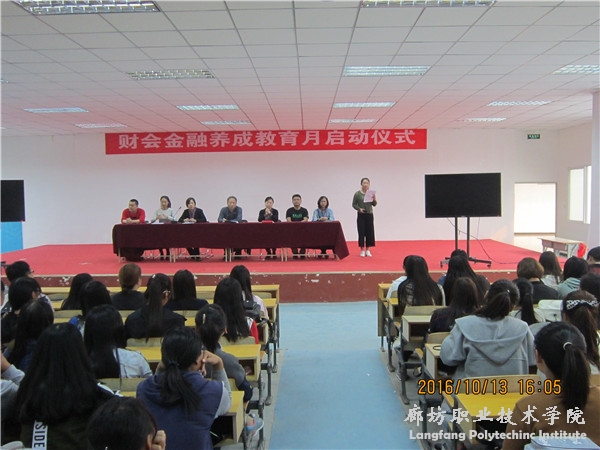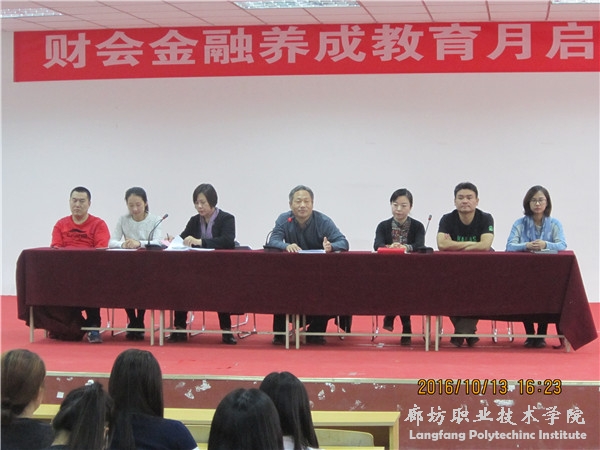 为进一步加强大学生思想政治工作,用“三个和谐”精神培养学生树立正确的价值观人生观,用“环保、节约、励志、团队、创新”的要求继续推进宿舍文化建设,将学生政治思想教育工作落到实处,财会金融系于2016年10月13日下午在实训楼四楼多功能厅召开大会,举行了“2016年养成教育月”启动仪式。系司金鹏书记出席动员会并讲话,大会由学生科吴洁副科长主持,全体辅导员、学生会干部、2016级新生参加了大会。