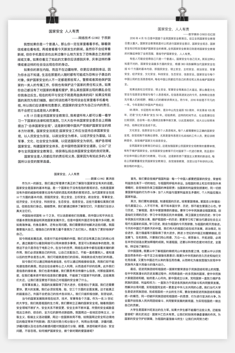 同时组织 “国家安全,人人有责”为主题的征文活动,计算机系学子积极投稿参与,用文字畅谈自己对国家安全的认识以及国家安全与个人的关系,以历史和生活中的实际事例说明国家安全与个人利益息息相关,每个人都应该为国家安全贡献自己的力量。