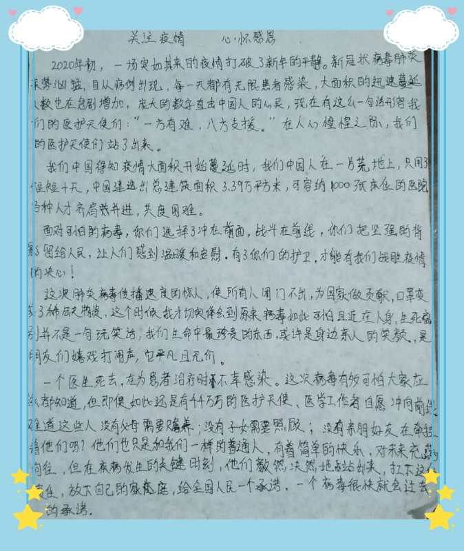 活动以班级为单位,同学们通过网络搜索抗疫英雄的事迹,了解疫情的相关知识,通过文字的形式记录下来,抒发同学们对抗疫英雄的敬佩,一段段优美的句子,一篇篇各具特色的征文,充分展示了我系同学时刻关注疫情,常怀一颗感恩之心的精神。