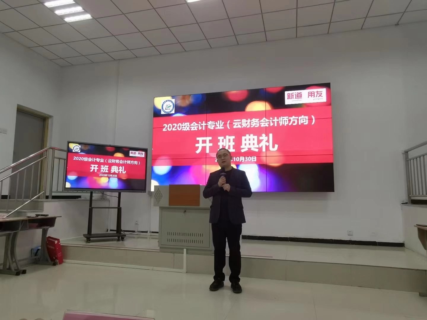 在开班典礼的最后,崔永帅总监为新生介绍了用友新道公司的企业背景,共建专业的优势和特点,并为同学们详细、生动地描述了云财务会计专业的人才培养目标和就业优势,为20级新生们带来了一场精彩的专业导读。