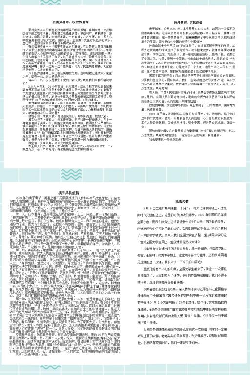 “文章合为时而著,歌诗合为事而作。”同学们围绕“众志成城,抗击疫情”主题,讴歌冲锋在前、“逆行而上”的先进故事,在祖国和人民需要的时候,无数医务工作者、共产党员、志愿者等挺身而出,以不同的方式参与到抗疫防护中,演绎了一幕幕感人至深的英雄故事;讲述抗击疫情中对亲情的守护,疫情让我们隔离了外界的打扰,与家人相互依偎,共度难关;畅谈个人感想,宅在家里,身边没有同学朋友的陪伴,经历了一段独处的时光;记录疫情期间的收获,城市静止,生活没有停顿,网课之余,学习新才艺、新技能、新厨艺。